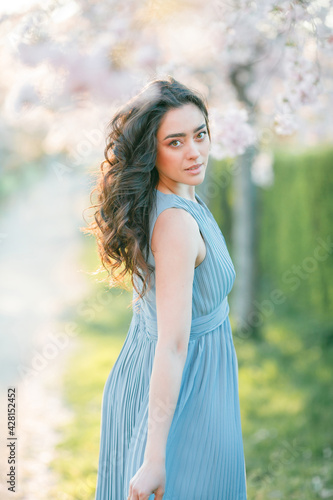 Beautiful young woman with curly hair is resting in the blooming sakura garden.