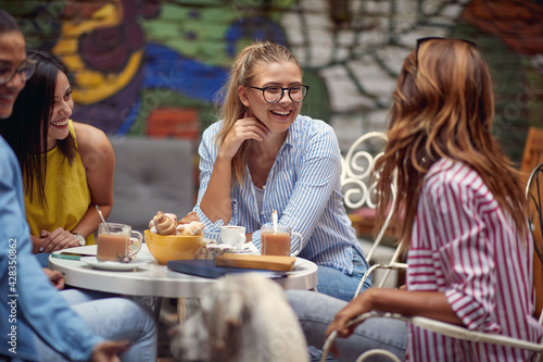 A group of female students is chatting in the bar's garden. Leisure, bar, friendship, outdoor