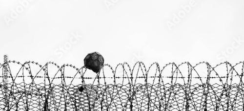 Ball auf Stacheldraht in schwarz weiss
