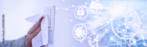 House cleaning concept. Wipe dust off surfaces. Disinfectant treatment of door handles TV electrical. Sanitary treatment at home in quarantine.