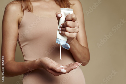 #1147755799Woman Applying Cream From White Tube on Hand Realistic PNG Cut Out.