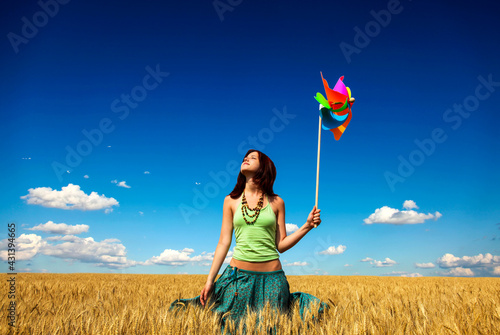 Girl with wind turbine at wheat field