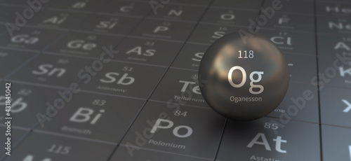oganesson element in spherical form. 3d illustration on the periodic table of the elements.