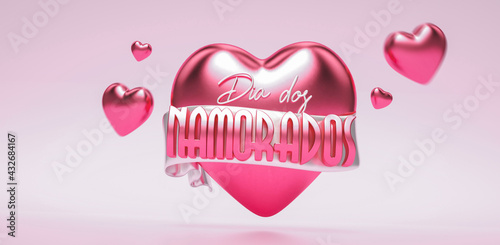Dia dos namorados texto 3d vermelho, com faixa e coração em fundo cor de rosa