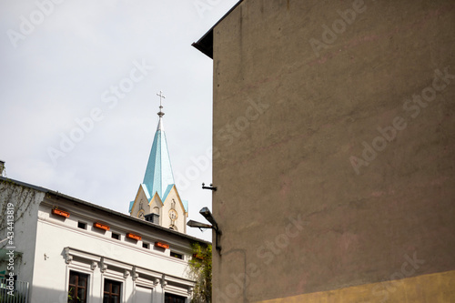 soaring church tower with a blue roof above the city, gray sky, Old Town, Oświęcim, historic buildings