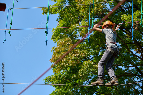 Chłopiec pokonujący na dużej wysokości trasę parku linowego.