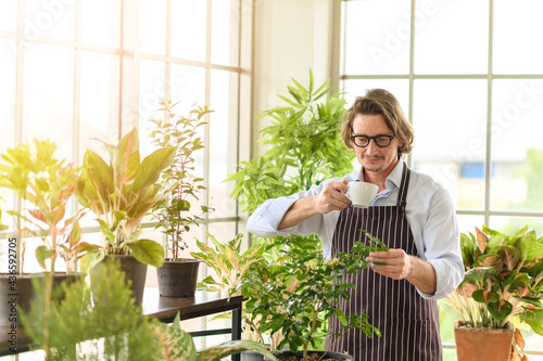 Portrait of happy senior man gardening wearing glasses and denim apron spending summer morning holding cup of hot coffee enjoying in the home gardening.
