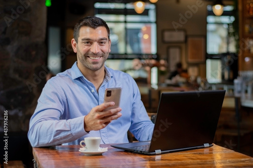 Hombre enviando un mensaje con el movil y su notebook laptop en un cafe despues del trabajo