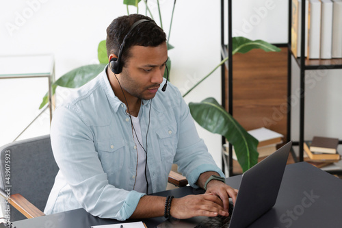Focused Indian customer support manager in headset chatting with client using laptop computer, young operator support hotline worker consulting a client online
