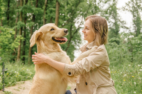 The mistress girl in the woods on the path hugs her dog of the Golden Retriever breed