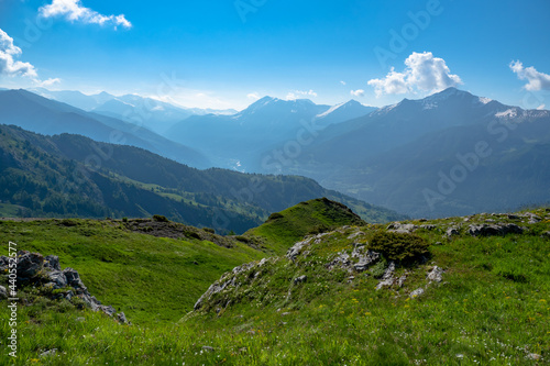 Springtime scenic view of the mountains in the Alps with emerging plant life and diminishing snow capped peaks