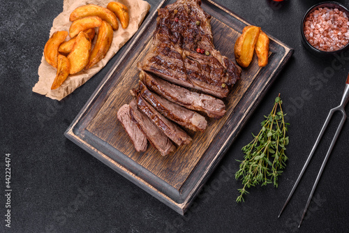 Delicious juicy fresh beef steak with spices and herbs on a dark concrete background