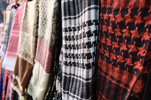 Colorful keffiyehs or kufiyas at middle eastern bazaar. Traditional Middle Eastern headdress fashioned from a square scarf and made of cotton