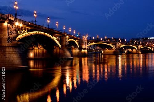 the Margaret bridge in Budapest at dusk. perspective side view. brightly illuminated steel arches. reflection on the water. tourism and travel concept. transportation and structural design.