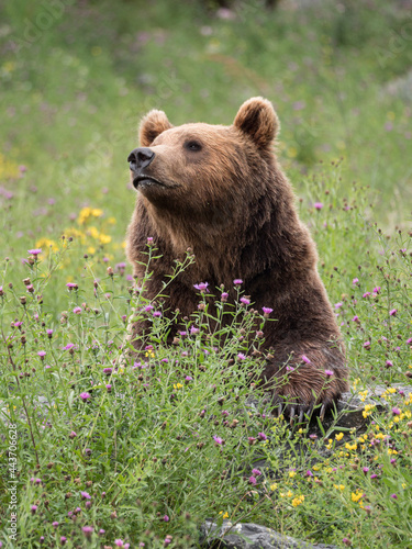 Portrait d'ours brun dans la végétation en fleurs