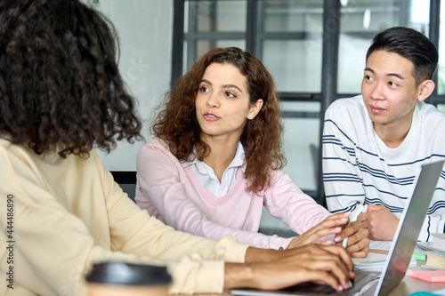 Serious concentrated multiethnic diverse young creative team students group talking brainstorming discussing online business project working at desk using laptop computer in office classroom.