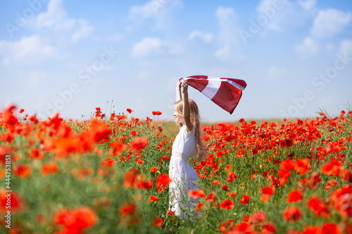 #449895900Blond girl holding flag of Latvia in the poppy field. Declaration of Independence Day. Ligo. Proclamation of the Republic. Travel and learn latvian language concept.