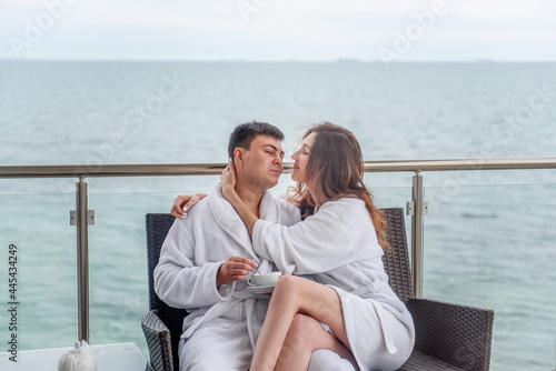 A couple in white bathrobes are sitting on an open terrace by the sea, drinking tea with lemon from cups. Lovers travel on vacation. Young man and woman hug each other. Newlyweds on their honeymoon