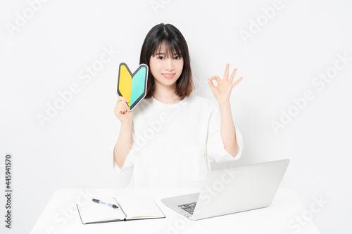 白背景の前でノートパソコンを使いながら、初心者マークを持っている、若い女性