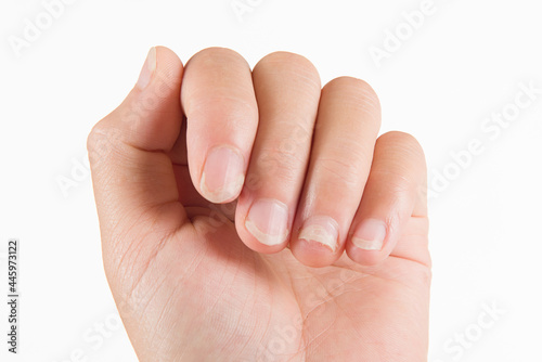 Onychomycosis or fungal nail infection on damaged nails after gel polish, onychosis.