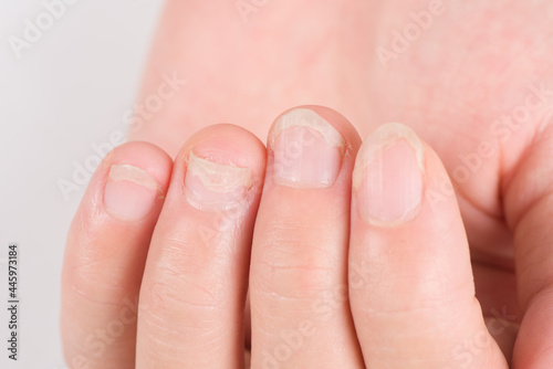 Onychomycosis or fungal nail infection on damaged nails after gel polish, onychosis.