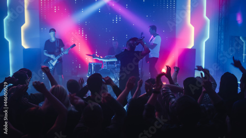 Rock Band with Guitarists and Drummer Performing at a Concert in a Night Club. Front Row Crowd is Partying. Silhouettes of Fans Raise Hands in Front of Bright Colorful Strobing Lights on Stage.