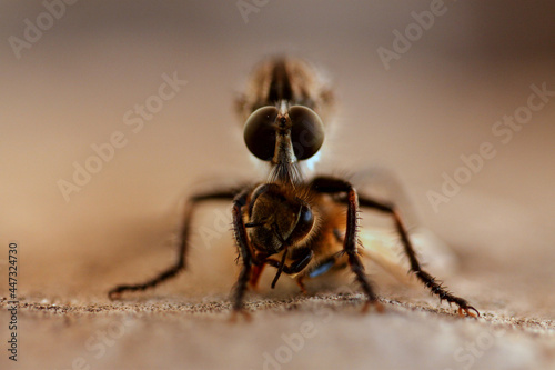 Close up macro shot of the head of a robber fly aka assassin fly eating a honey bee