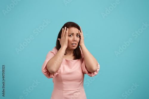 Disgusted shocked caucasian female with dark hair in pink dress is horrified, saw something inappropriate. She touches head with hands and looks at camera with fear, isolated on blue background.