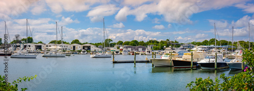 Tranquil marina landscape with moored ships under dramatic clouds in Falmouth on Cape Cod.
