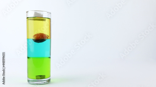 Liquid or layer density experiment using 3 separate layers consisting of syrup, water and olive oil on the top layer. There are objects used for testing such as metal, strawberry and styrofoam.