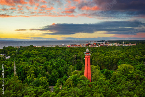 Red lighthouse on the Hel Peninsula at sunset. Poland.
