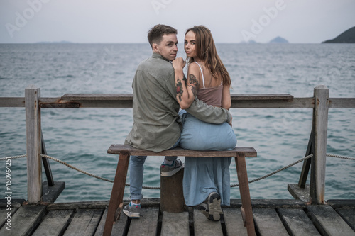 Beautiful young couple in love sitting on the bench by the sea, cuddling and looking at camera with copy space. High quality photo