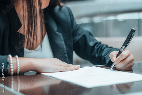 Mujer joven firma en un papel un contrato de trabajo junto a su ordenador