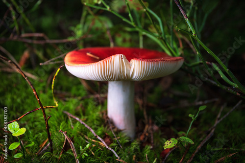 Red mushroom Russula russula in the forest close-up on a dark, with a shallow depth of field