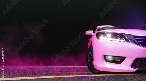 Pink sport modified car with smoke and pink neon on the asphalt road at night,copy space