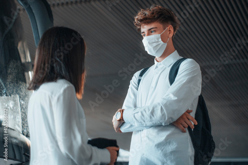 Trabajadores jóvenes con mascarilla esperando el autobús para viajar a su destino charlando