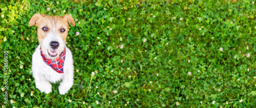 Cute happy obedient dog puppy begging, listening in the grass, pet training banner