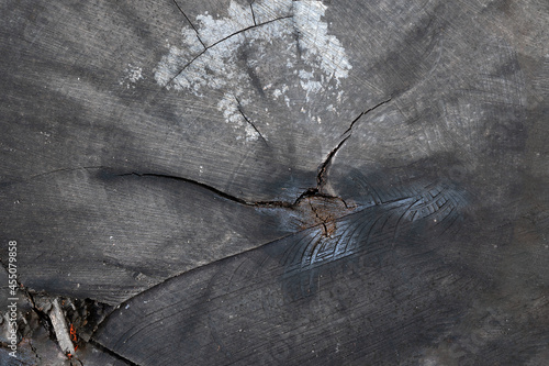Black cross section of the tree texture background. Weathered wood section. Sawn off logs exposing cross-section with cracks. Closeup. Texture of background