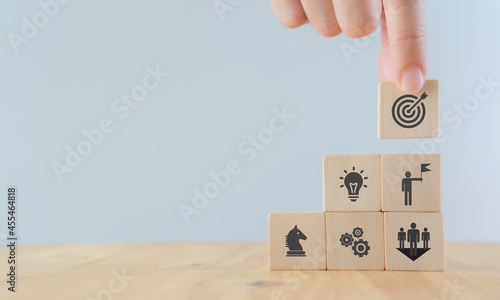 Business, success, leadership and achievement concept. Man hold wooden cube with goals and success icon and other icon with the element process to achieve; strategy, solution, teamwork, leader, idea.