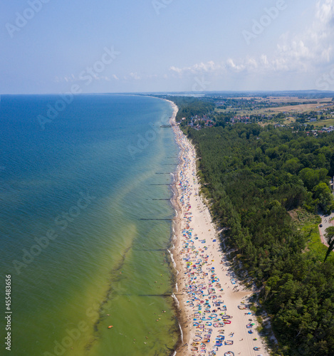 Sarbinowo nad morzem bałtyckim, widok z lotu ptaka na wybrzeże z opalającymi się plażowiczami, w tle plaża w miejscowości Chłopy