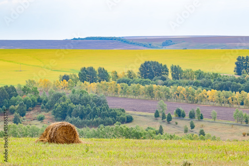 a lonely, one round haystack lies in a meadow against the background of many hills, trees and agricultural cultivated land