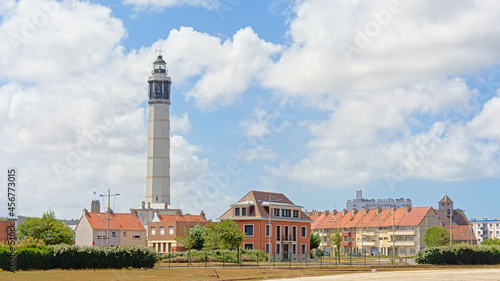 Calais lighthouse or Phare de Calais, towering above the houses of a residential neighborhood in Calais, France on a sunny day with clear blue sky