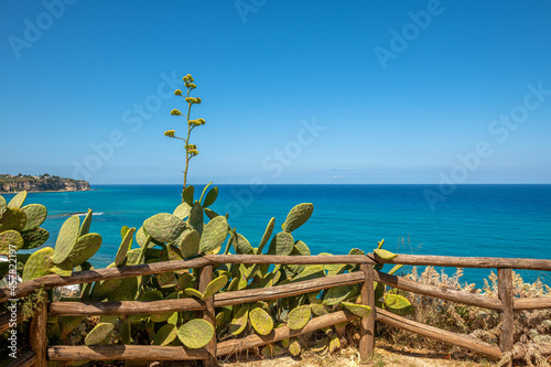 dziko rosnąca opuncja na urwisku za barierką z drewna