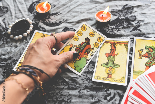 Show fortune tellers of hands holding tarot cards and tarot reader with candle light on the table, Performing readings magical performances, Things mystical astrologists forecasting concept