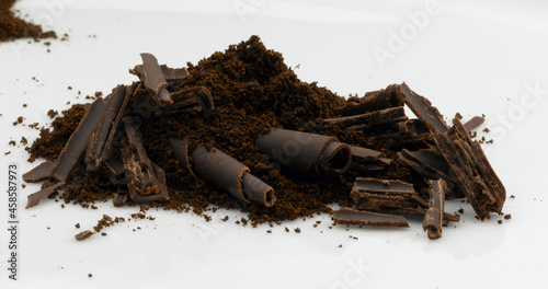 Chocolate negro, virutas sobre fondo blanco. dark chocolate chips on white background