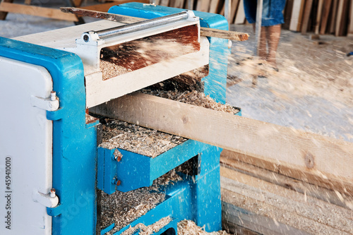 A wood plate passing through the thickness planer machine in a carpentry workshop.