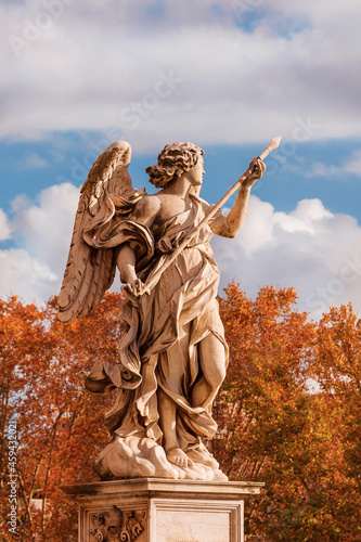 Autumn in Rome. Beautiful angel statue with Holy Lance of Longinus at the top of Sant'Angelo Bridge, erected in the 17th century, with atumnal leaves in the background