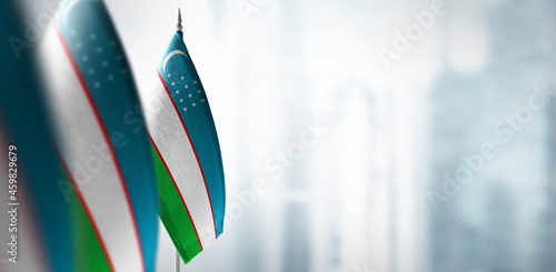 Small flags of Uzbekistan on a blurry background of the city