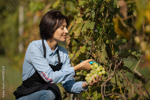 Charming caucasian lady in black apron cutting bunch of white grape with gardening scissors outdoors. Concept of farming, harvesting and winemaking.