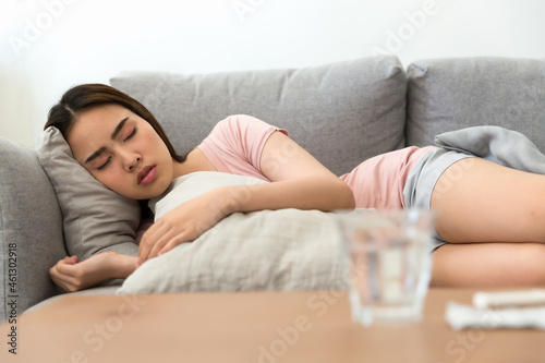 Young woman is sick, unwell, cold and sleep on the sofa. After taking medicine